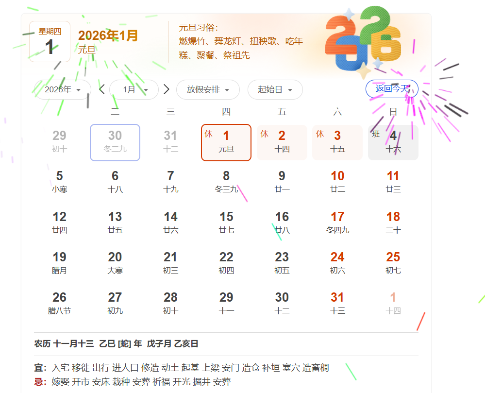 - [15] 元旦假期将至 2026放假日历提前收藏.(2025-12-29) https://news.cctv.com/2025/12/29/ARTInhrENbHw5LqaS0ZoU5vc251229.shtml