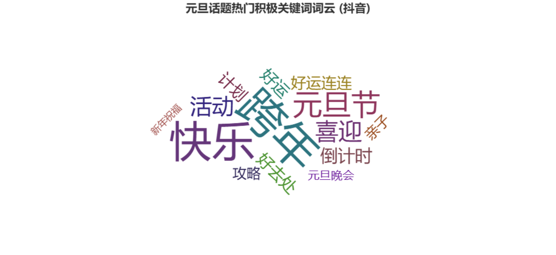 通过分析高频关键词,可以更清晰地洞察用户积极情绪的来源。在主导平台抖音上,“快乐”、“跨年”、“元旦节”、“喜迎”等词汇互动量极高,直接反映了用户对节日的喜悦与迎接新年的兴奋。 [11]