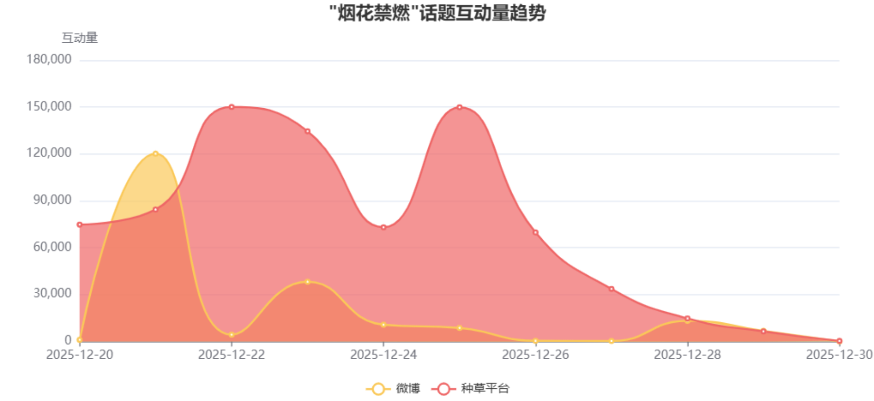 “城市烟花禁燃”政策是元旦前后极具争议性与高热度的话题。虽然初步检索未发现数据,但通过扩展关键词发现,该话题在微博和种草平台引发了巨量互动,互动量峰值远超其他消费话题,显示出极高的社会关注度。 [28,29]
