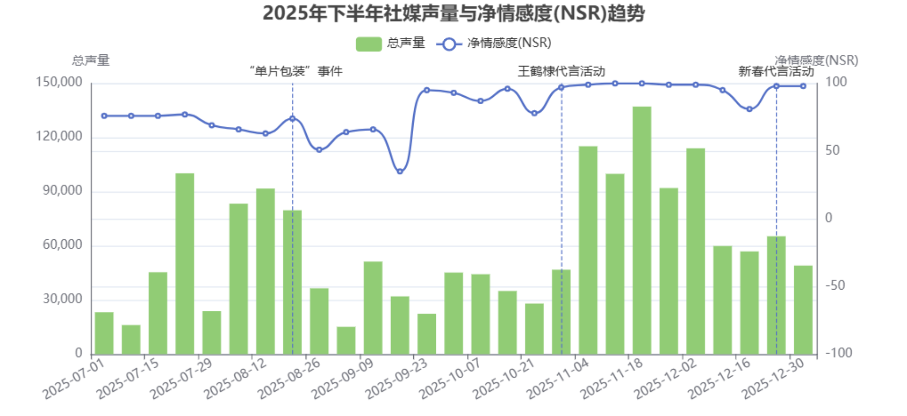 - 声量高峰与明星效应 :11月初,声量达到周期内顶峰,与 王鹤棣代言活动 的官宣时间(10月31日)完全吻合,NSR也同步飙升至接近100的满分水平,验证了顶级明星合作对声量和正面情绪的强大引爆能力 [18,19] 。
