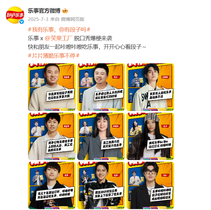 “我有乐事你有段子吗”(7月) :联合多位脱口秀演员在抖音发起话题挑战,将产品与幽默内容场景结合 [22] 。