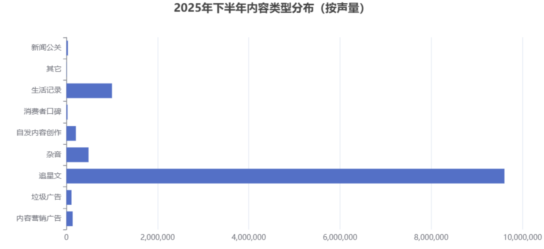 乐事在2025年下半年的内容矩阵以明星效应为核心,通过多元化的内容类型触达不同圈层。数据显示, “追星文”是声量的绝对主体,占比高达82.69% ,这与品牌高度依赖明星代言的策略相符 [17] 。其次是“生活记录”(8.61%)和“自发内容创作”(1.80%),表明品牌已成功融入消费者的日常分享场景中 [17] 。
