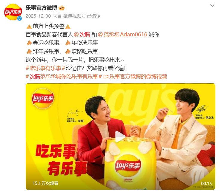 沈腾与范丞丞新春代言(12月) :联合“腾丞万里”组合,推出#吃乐事有乐事#新年主题活动,通过幽默广告片抢占年货市场心智 [5] 。