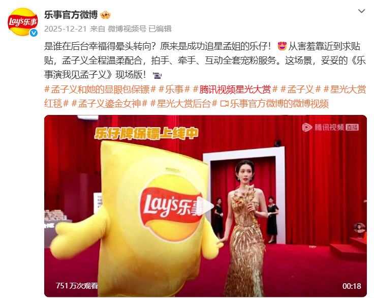 - 圈层渗透与口碑发酵 :虽然互动数据不如顶级明星,但与垂类KOL及多位明星的广泛合作,成功将#吃乐事见明星#等活动信息渗透到不同圈层,形成了多点开花的传播态势。吉祥物“乐仔”在星光大赏等活动中与明星的趣味互动,也创造了#孟子义和她的显眼包保镖#等热点话题,有效提升了品牌的趣味性和好感度 [5] 。
