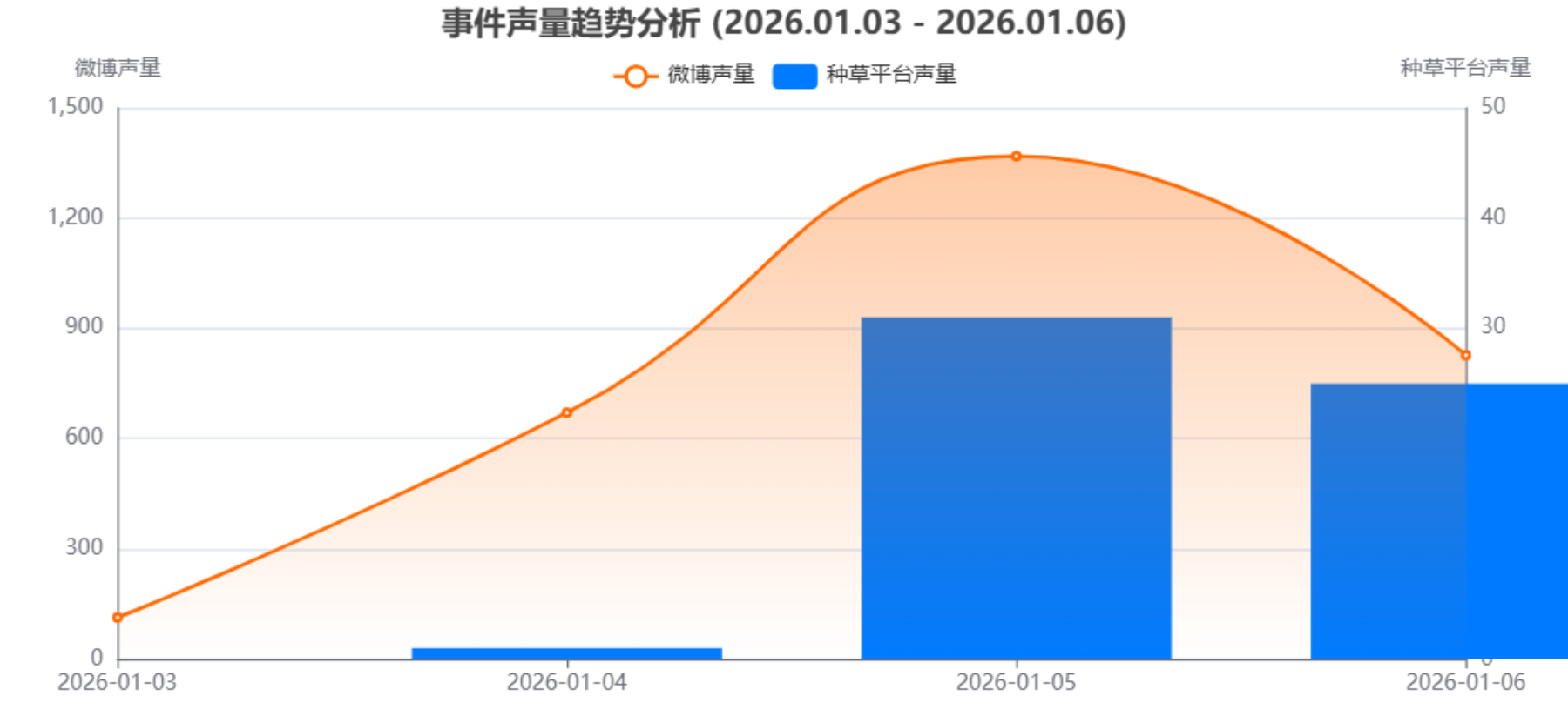 事件的声量趋势清晰地反映了舆情从发酵到爆发的全过程。在2026年1月3日之前,相关讨论声量处于日常低位。从1月3日开始,随着合作传闻的扩散,微博声量显著上升至 113条 。 [3] 1月4日,声量急剧攀升至 671条 ,显示事件已快速破圈,引发了大规模关注。 [3]