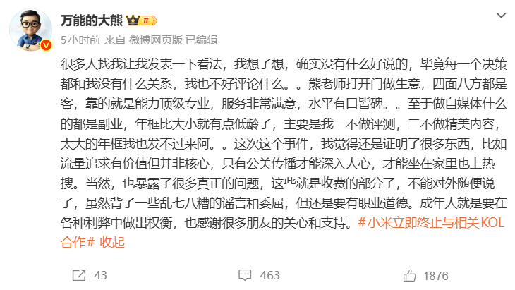 小米与“万能的大熊”的合作争议事件,为所有品牌方提供了一次深刻的KOL营销风险管理实战教学。它清晰地揭示了在当前社交媒体环境下,KOL营销早已超越单纯的流量采买,而是与品牌价值观、用户情感和社群生态深度绑定的复杂工程。