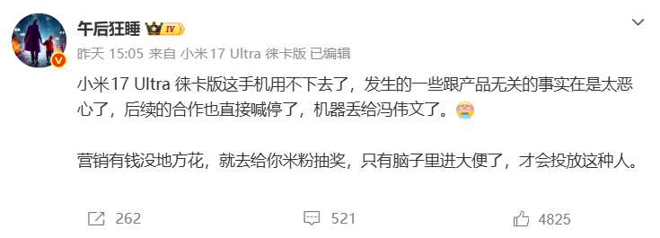 大量“米粉”感到被品牌背叛,他们长期“为爱发电”维护品牌,却换来与“敌人”合作的结果,导致信任崩塌,甚至出现“脱粉”和出售产品等极端言论。 [21]