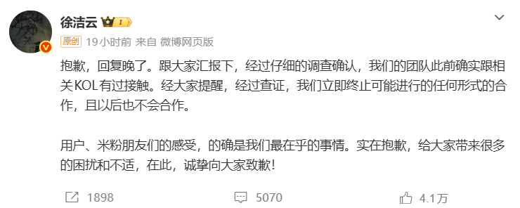 该声明发布后,迅速成为新的舆论焦点,相关话题#小米徐洁云致歉#登上热搜。 [2] 尽管小米的快速反应和致歉态度在一定程度上缓解了部分用户的负面情绪,但并未完全平息争议。许多用户在评论中继续追问公关团队的决策失误责任,并对品牌是否真正吸取教训表示怀疑。 [21] 有观点认为,与一个曾公开发表“小米不会死,死的是米粉”等言论的KOL接触,本身就暴露了小米内部在KOL筛选和风险评估机制上的严重疏漏。 [30,31] 因此,尽管危机得到初步控制,但其对小米品牌形象和用户信任造成的长期挑战依然严峻。