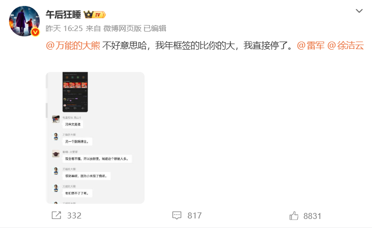 随着事件发酵,多位米粉及亲小米的KOL公开表达了强烈不满。其中,知名博主“午后狂睡”宣布暂停与小米的一切合作以示抗议,另一位拥有大量小米设备的忠实用户“伤感的小羊同学”则发帖威胁将出售所有小米产品。 [5] 这些来自核心圈层的激烈反应,迅速将话题#大熊 小米#推上微博热搜,使这场争议从粉丝圈层扩散至公众视野,引发了关于小米品牌价值观和公关策略的广泛讨论。 [15] 用户讨论的焦点在于,小米此举是否漠视了长期支持品牌的忠实用户的感受,以及品牌在追求“广结善缘”的公关策略时,是否应坚守与核心用户群体的情感契约。 [29,22]