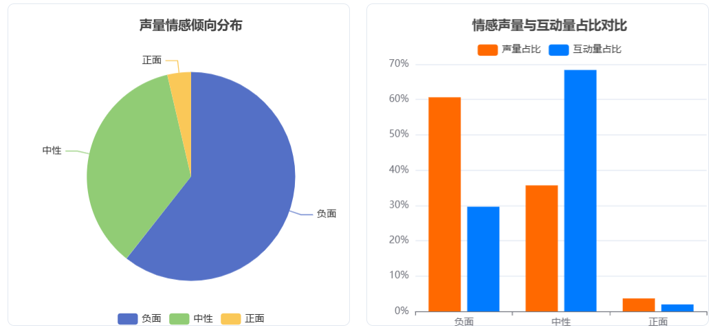 一个值得关注的现象是声量与互动量在情感分布上的显著差异。负面声量虽高,但其互动量占比仅为 29.6% 。与此形成鲜明对比的是,占比 35.7% 的中性声量,却贡献了高达 68.4% 的互动量。 [1] 这一数据结构揭示,大量用户在事件中扮演了信息传播者和“围观者”的角色,他们通过转发、无明确情感色彩的评论等方式参与讨论,而非直接表达强烈的负面情绪。这部分庞大的中立互动群体,也构成了品牌进行危机公关时可以争取和引导的关键对象。 [6]