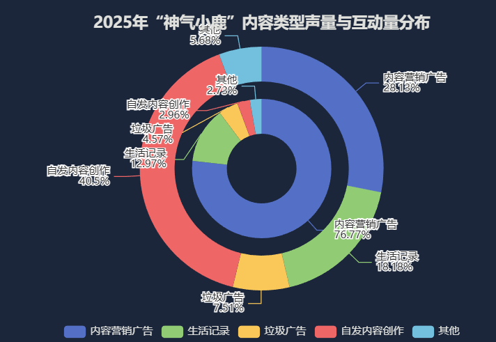 2025年,“神气小鹿”的内容策略主要依赖 内容营销广告 ,该类型在声量和互动量上均占主导。同时,品牌也通过引导 生活记录 和激发 自发内容创作 来增强用户口碑,后者贡献了高达40.5%的互动量,显示出强大的用户共鸣潜力。 [3]