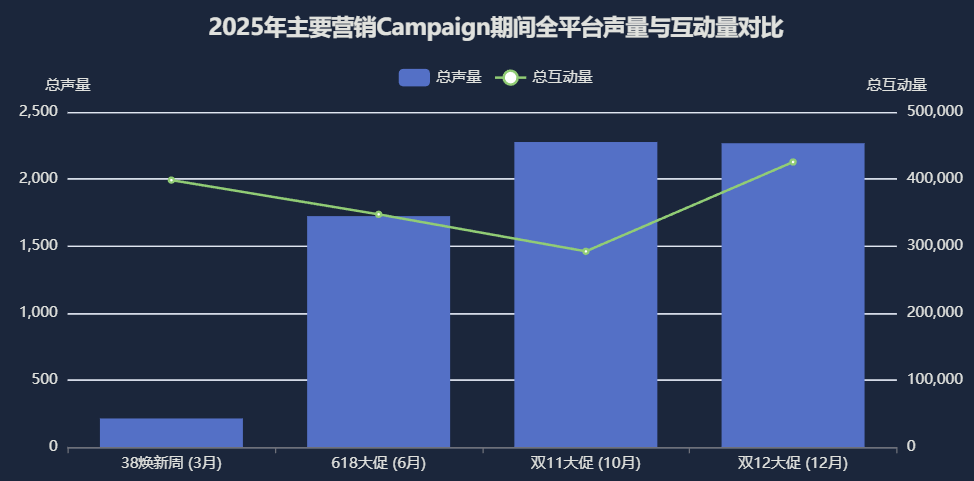 从上图可以看出, 双11和双12大促 期间,品牌总声量达到顶峰,显示出品牌在这两个节点的营销投放力度最大。而在互动量方面, 双12大促期间 的总互动量最高,这与李佳琦直播带货以及抖音平台的互动爆发高度相关。 [5,23] 38焕新周期间虽然声量不高,但互动量表现强劲,主要由B站贡献。618大促期间声量和互动量均有显著提升,为下半年的爆发奠定了基础。