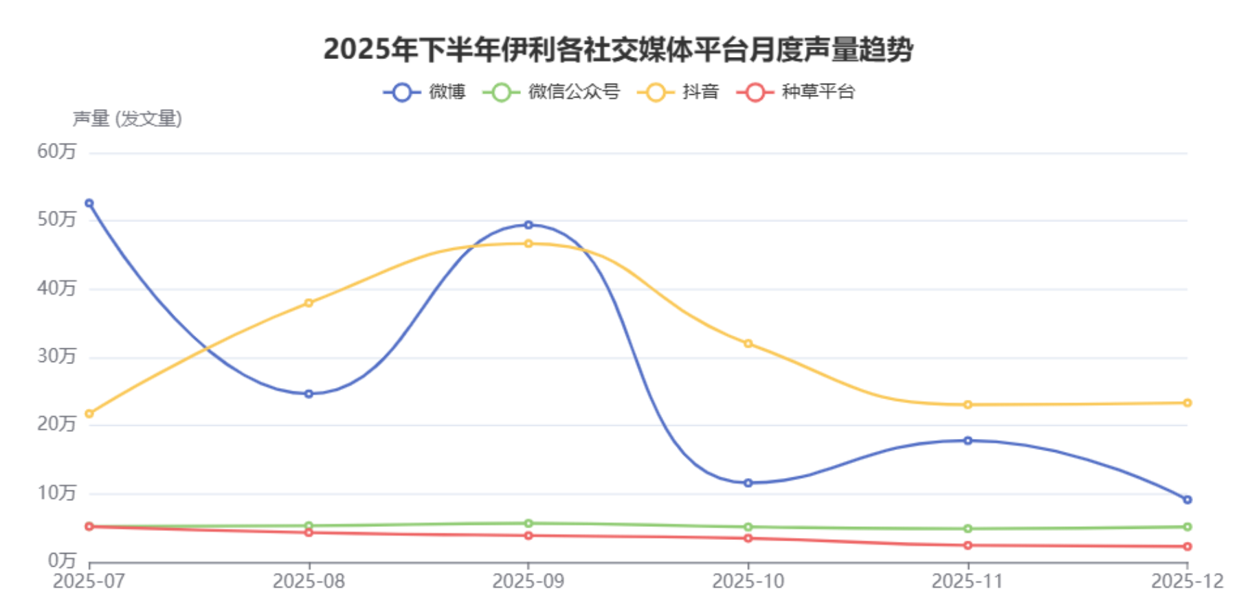 伊利在2025年下半年在各主要社交媒体平台上的品牌声量与互动量表现,呈现出显著的平台差异化特征。抖音以其强大的互动效率占据主导地位,而微博则作为信息发布的重要阵地,微信公众号和种草平台则各有侧重 [1] 。