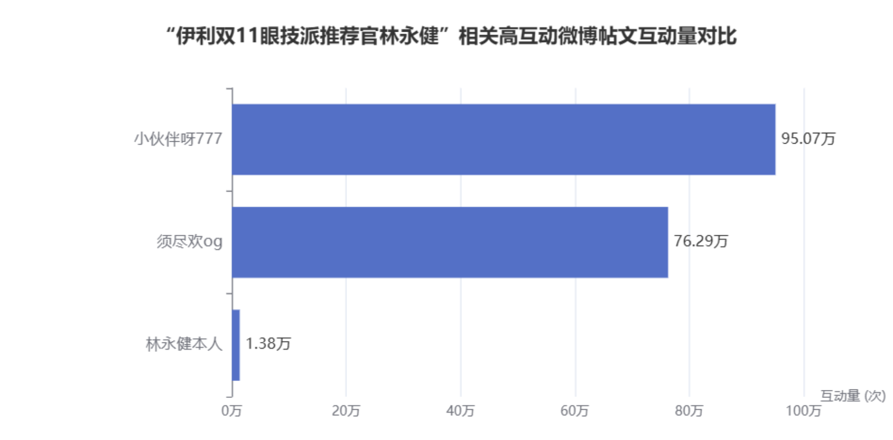 尽管林永健本人发布的推广内容互动量为 13,836 次,相对温和,但该营销事件的整体声量不低,主要得益于其他高互动量账号的二次传播和内容放大效应。例如,用户“小伙伴呀777”发布的相关微博帖子互动量高达 950,712 次,“须尽欢og”的帖子也达到 762,910 次 [15] 。这些数据表明,该活动通过多层级的达人合作和粉丝社群的积极参与,成功在微博平台制造了显著的话题热度。针对 #伊利双11眼技派推荐官林永健# 这一话题,在2025年下半年期间,微博平台共产生了 **9,133** 条发文量,互动量累计达到 1,760,681 次 [3] 。然而,由于数据限制,同样无法获取该活动在各平台声量、互动量及净情感度的 **日变化趋势** [17,21] 。