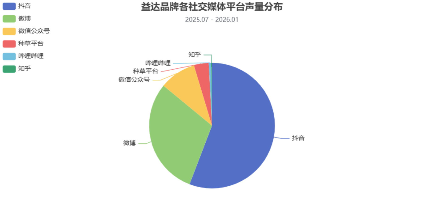 数据显示,益达在社交媒体上的声量和互动主要集中在抖音和微博两大平台。抖音是绝对的主力阵地,贡献了高达 55.8% 的品牌声量和 61.8% 的互动量,这得益于其短视频内容形式的强传播力和高用户参与度。微博则以 30.1% 的声量和 27.1% 的互动量位居第二,在明星代言和话题营销方面发挥着关键作用。其他平台如微信公众号、种草平台和B站也贡献了部分声量,形成了多平台协同的传播矩阵 [1] 。