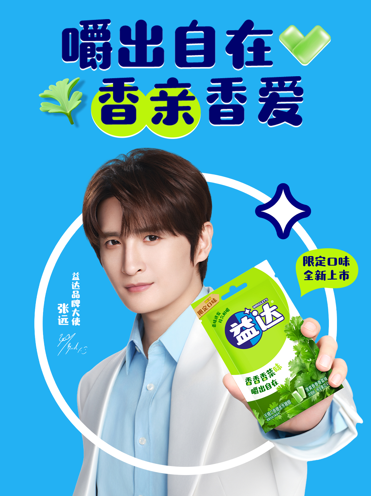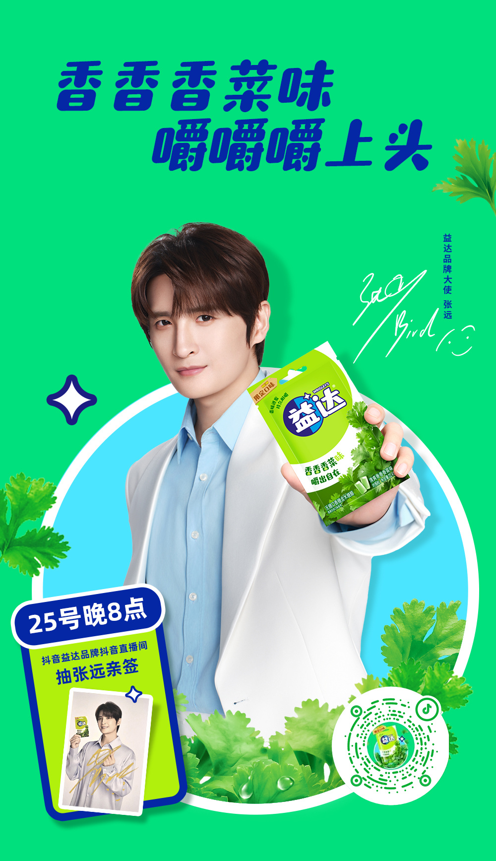 报告期内,益达官宣吴磊为全新品牌代言人,并与张远以品牌大使身份合作。这一策略体现了差异化考量:吴磊以其阳光健康的形象,强化“嚼出自在好状态”的品牌主张;而张远则深度绑定香菜味新品,以其幽默亲和的个人魅力和“婚庆歌手”人设,为新品推广增添了趣味性和话题性,有效带动了粉丝互动和产品关注度 [7,18] 。