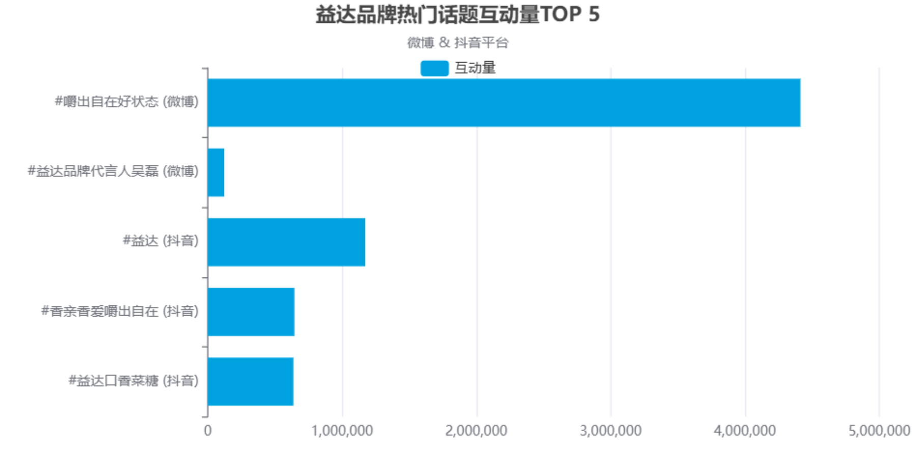在报告期内,与益达品牌相关的热门话题和高频关键词清晰地反映了其营销重点。 “#嚼出自在好状态” 这一品牌Slogan在微博平台获得了超过441万的互动量,展现出强大的品牌资产和用户共鸣 [2] 。与营销活动紧密相关的话题也表现突出,例如,微博上的 “#益达品牌代言人吴磊” (12.2万互动)、 “#益达⻰⻁联名” (11.6万互动)以及抖音上的 “#香亲香爱嚼出自在” (64.5万互动)和 “#益达口香菜糖” (63.8万互动)均获得了大量关注,验证了这些营销战役的成功 [2] 。